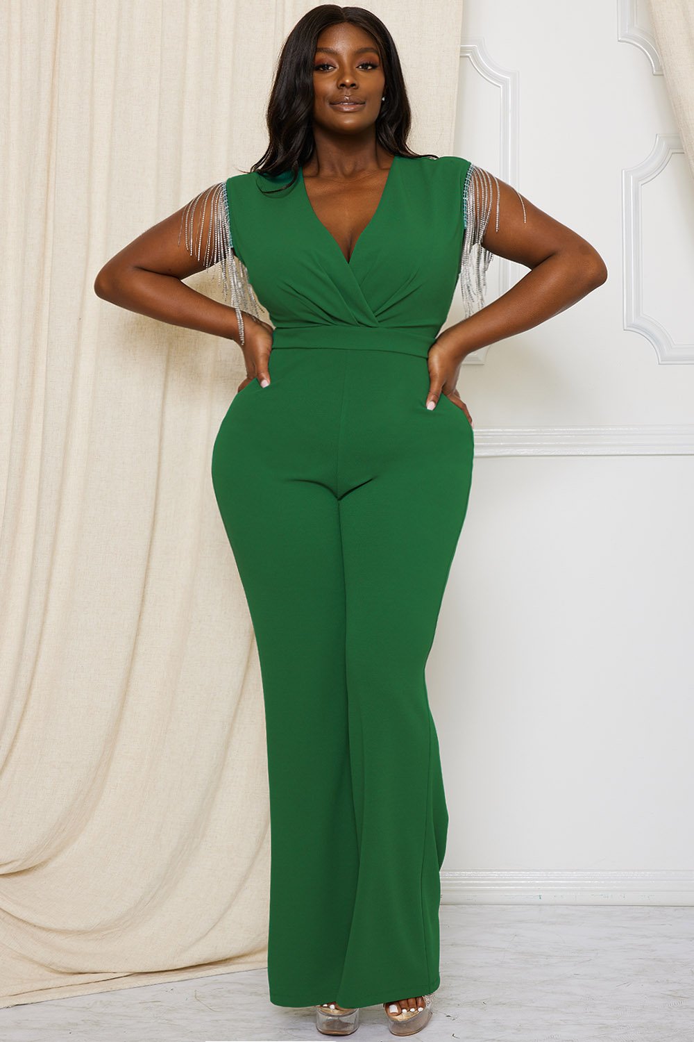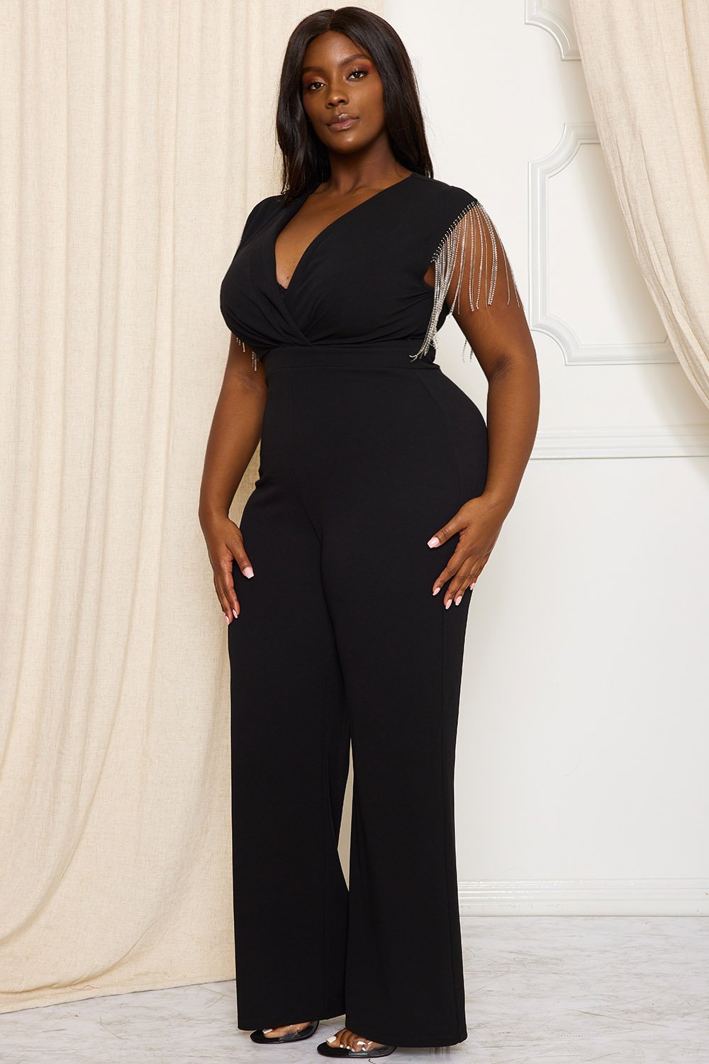 CRYSTAL AND METAL CHAIN FRINGE SLEEVE PLUS SIZE JUMPSUIT